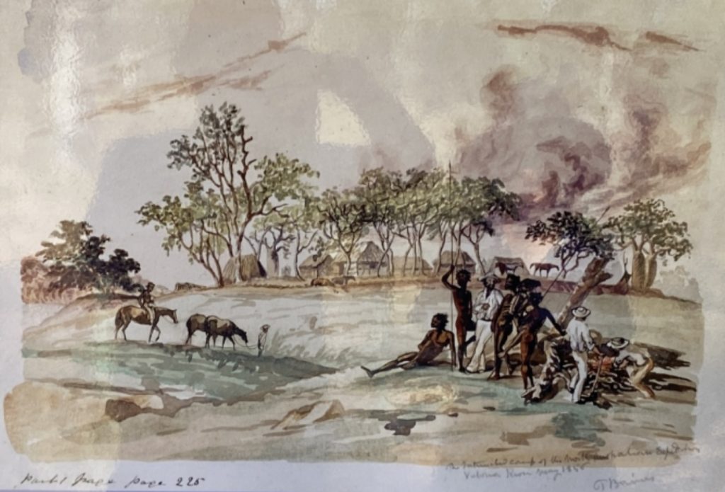 While the exploration party encountered many challenges on their journey into the Victoria River, the site selected for the base camp, located near the ford on the river, turned out to be an excellent choice. It was sheltered by box and eucalypt trees and shaded by the occasional wattle. Two splendid boab trees stood in the centre, and the campfire was set up beneath one of them.