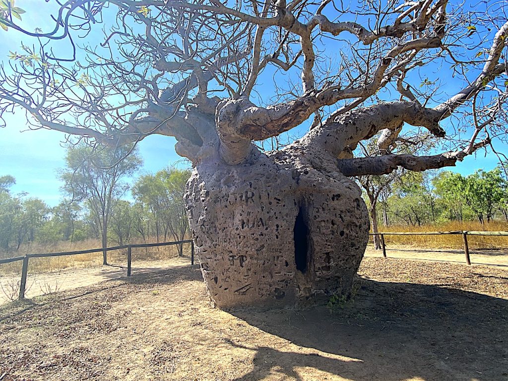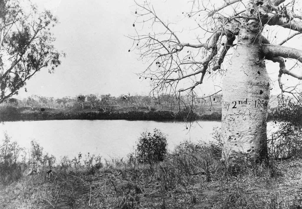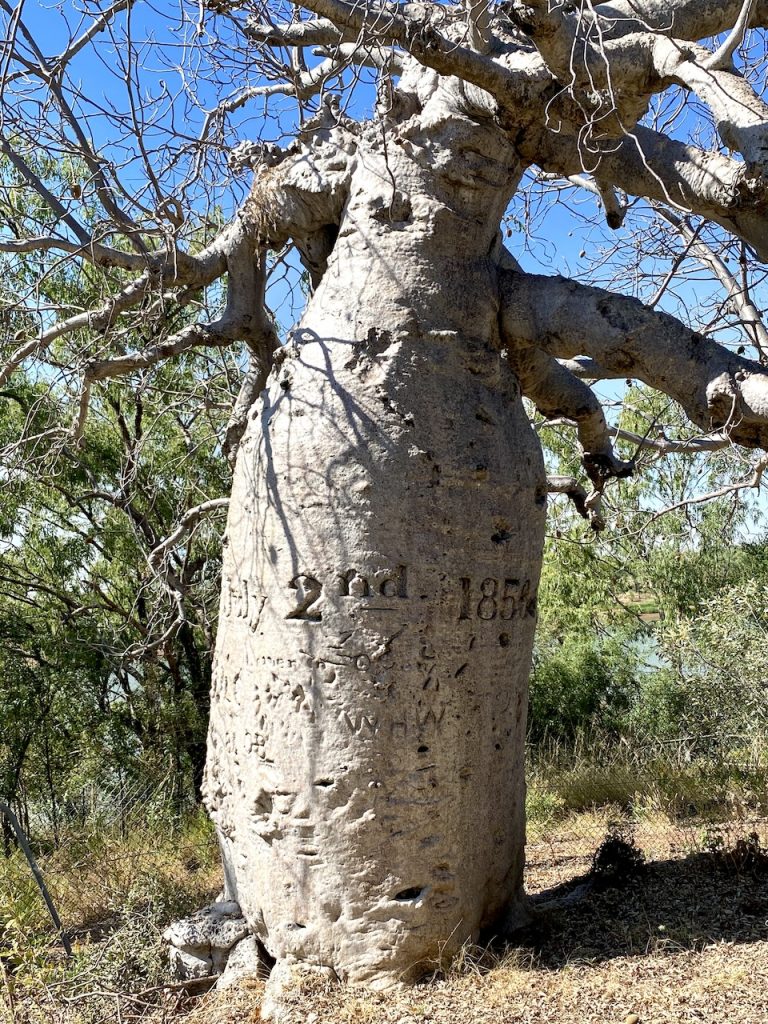 Thomas Baines, the expedition artist, carved their initials into the bark of a massive boab tree along with the arrival and departure dates of the expedition party. It remains a crude yet lasting record of their passage.
