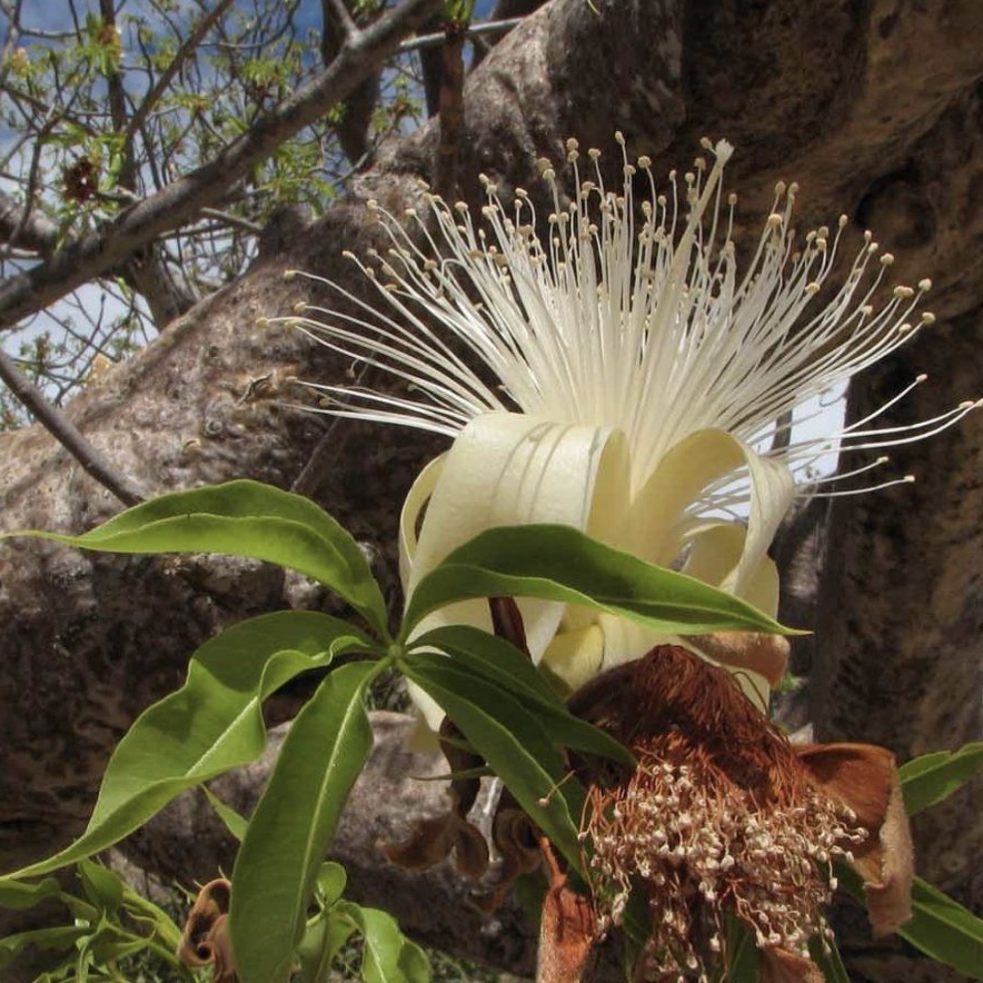 The boab is stark and leafless for much of the dry season but is festooned with brilliant green leaves during the wet season. At this time, it also bears large white, showy flowers that have no perfume unless they are bruised, at which point they soon ferment, emitting a scent reminiscent of rotten meat. At the base of the branches are peculiar depressions in the trunk. Aboriginal people drink the water that collects there during the wet season. They also consume the seeds and the white, spongy pith in the furry, gourd-like fruit. Aborigines value these fruits for their edibility and medicinal uses. The bark from the roots is also beaten to produce string.