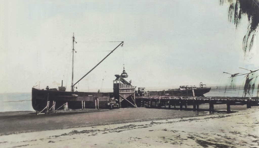 The Palmer had a somewhat celebrated career. In 1935, the Burrum Shire Council decided to seal the Esplanade between Urangan and Point Vernon. The gravel deposit along the western beach of Woody Island (unlike Fraser, it is not a sand island) was identified as suitable for the road base, as the stones were already cemented together by the acids that percolated through the gravel bed.