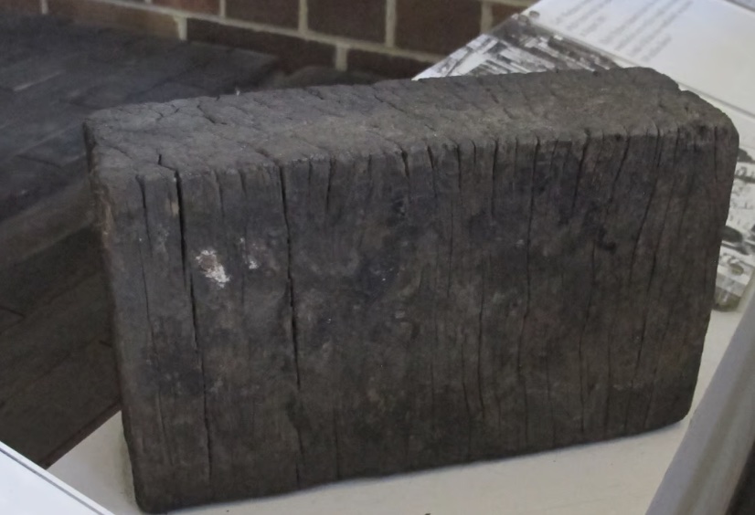 Each wooden block was sawn into six-inch lengths from 9 x 3-inch planks. While four inches would have sufficed, six inches was preferred because when the tops of the blocks wore down, they could be cut down to four inches and re-laid.