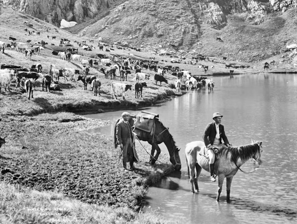 By the 1830s, white settlers from the Monaro, Canberra, and Goulburn districts were driving cattle into the Snowy Mountains each summer. The so-called “snow belt” was rarely covered in snow year-round, but after spring melt, its high plains and frost hollows provided lush pasture of tussock grass, broadleaf herbage and swamps, making them ideal for summer grazing. Below the treeline, even timbered slopes supported stock sufficiently to make the trip worthwhile. Carrying capacity was measured in hectares per sheep, not the other way around, and the grazing season ran from October to early May.