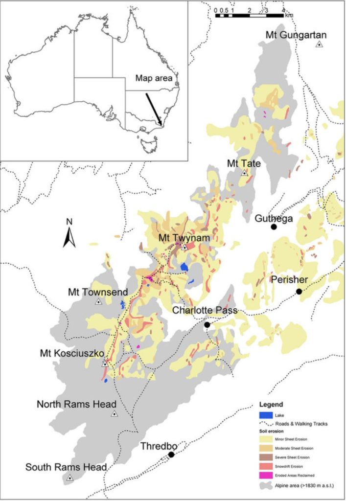 The reality was that erosion was only severe in a limited three-kilometre section of the Main Range between Carruthers Peak and the eastern face of Mt Twynam – a very steep and exposed area.