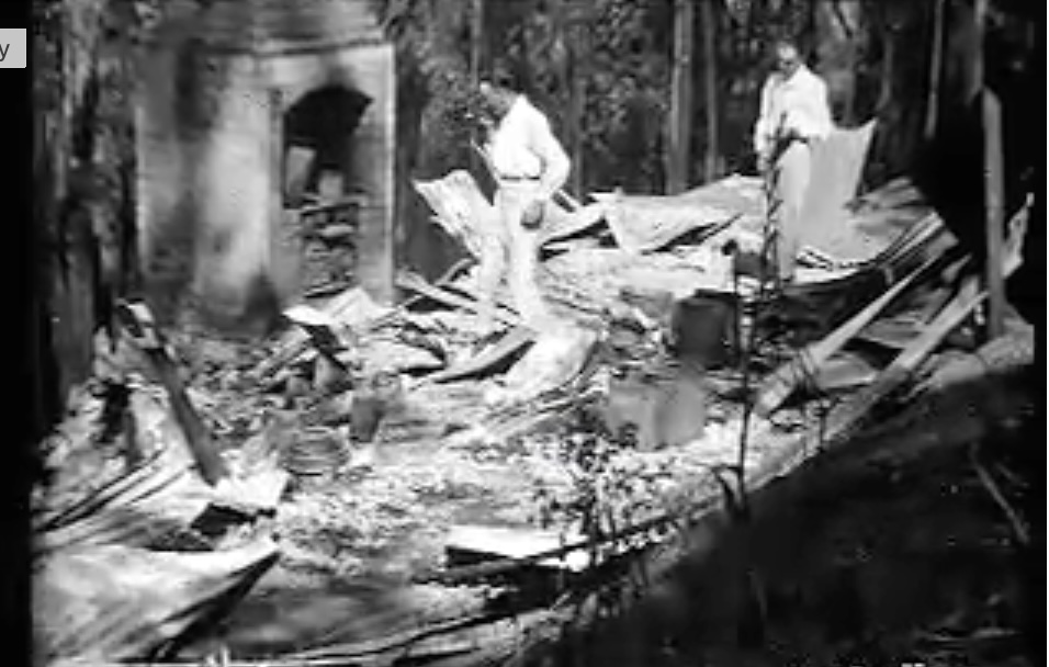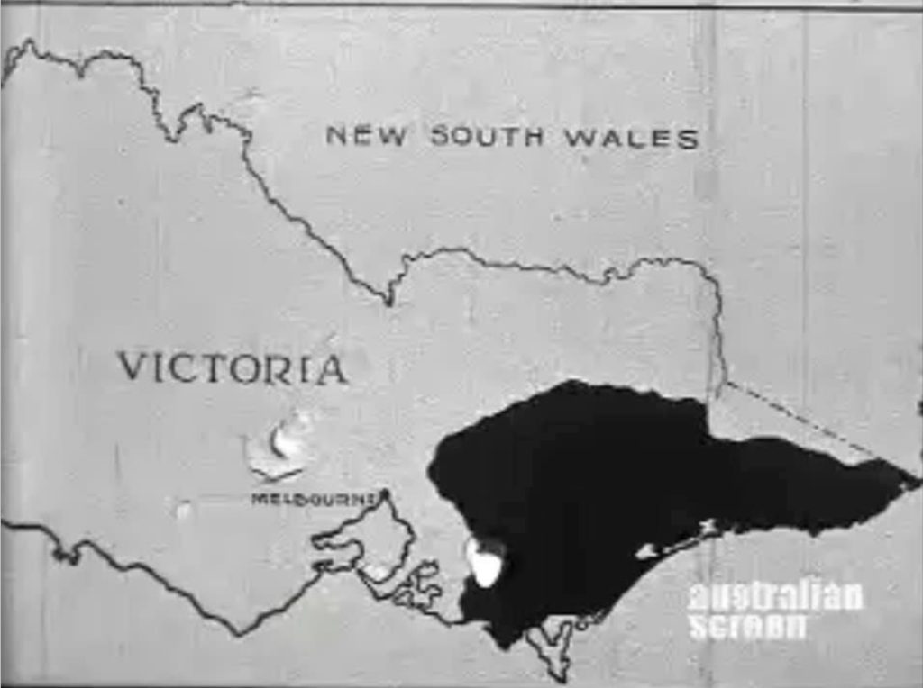 The Dandenong Ranges also suffered from severe fires. On “Black Sunday,” fire fronts driven by gale winds swept through the area, destroying buffer vegetation around Melbourne’s foothills. A clip of the event from archive footage shows cars driving along smoke-filled roads with bush on fire on both sides. FCV made the film to raise money for the bushfire relief efforts. Unfortunately, during the filming, the commissioners and the minister were caught in the flames near Morwell and were lucky to escape.