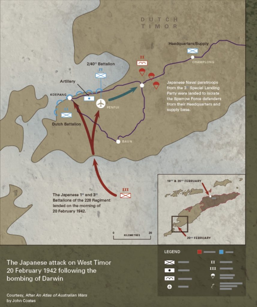 By this time, Lark Force had been overwhelmed at Rabaul and Gull Force destroyed on Ambon. Sparrow Force was now the last Australian formation standing between a Japanese force advancing south and the Australian mainland.